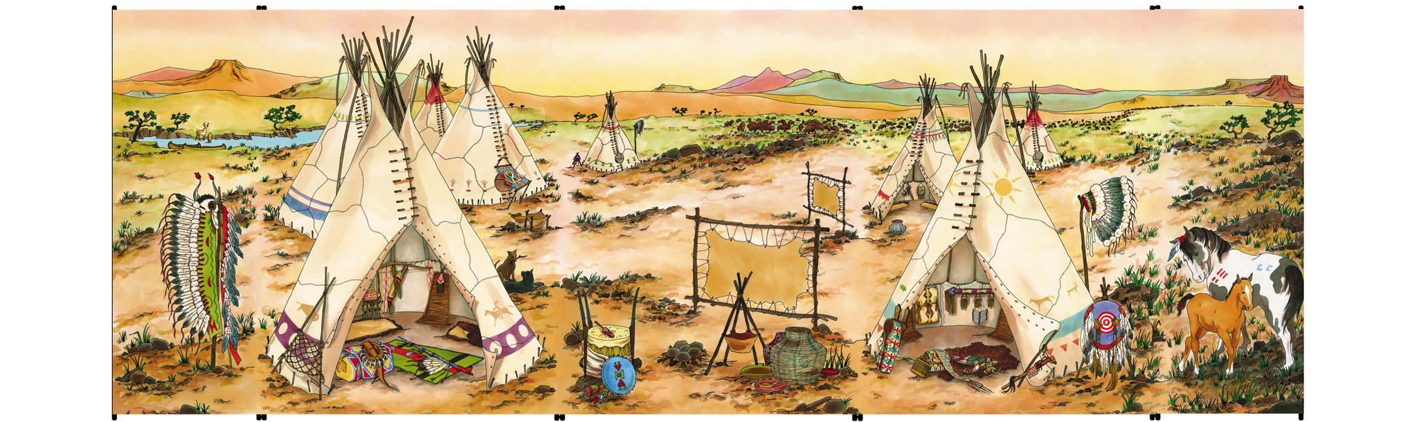 The 5-foot tall x 14-foot wide backdrop includes two scenes: Native Americans + Cowboys. Kids can pretend they are living on the expansive Great Plains region during the 1800s.
